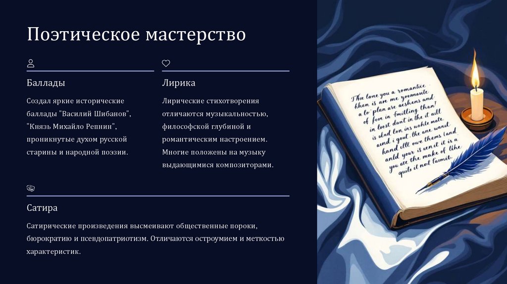 исторического романа, поэтической драмы и сатирической литературы. Его