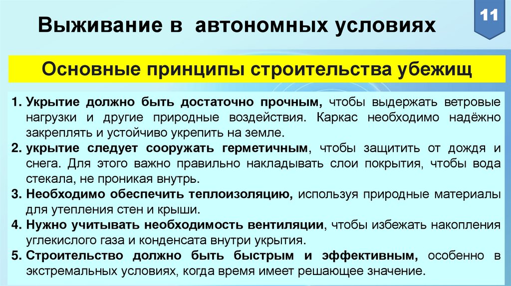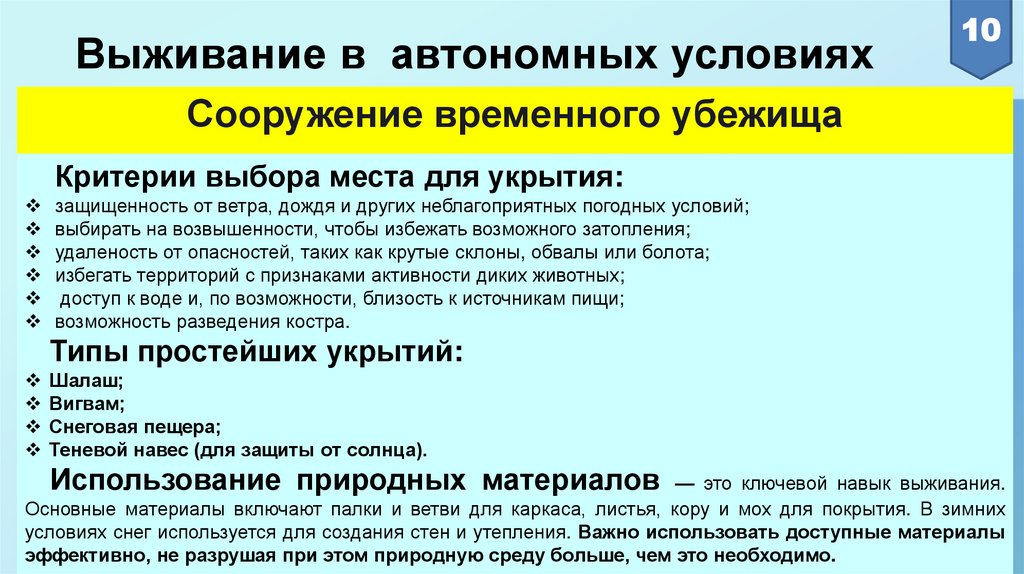 опасности, способы сооружения убежища, добывания воды и пищи, защиты от