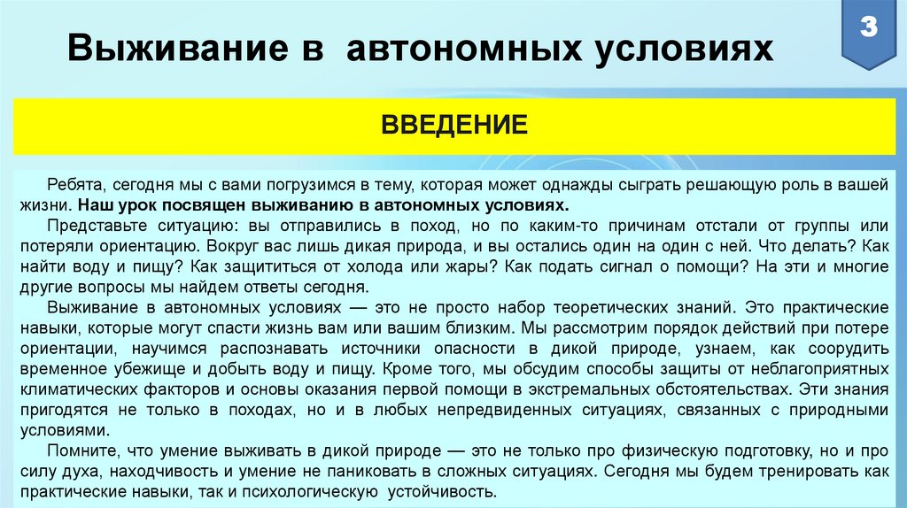 жизни. Наш урок посвящен выживанию в автономных условиях.