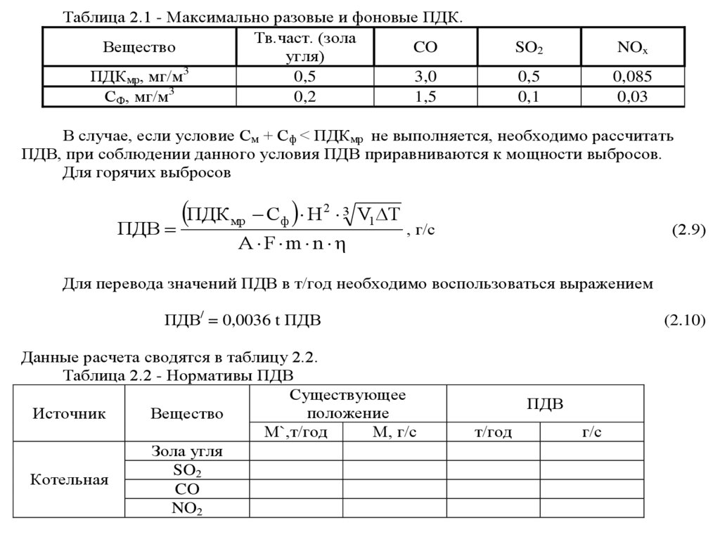 Максимально разовые и фоновые ПДК приведены в таблице 2.1