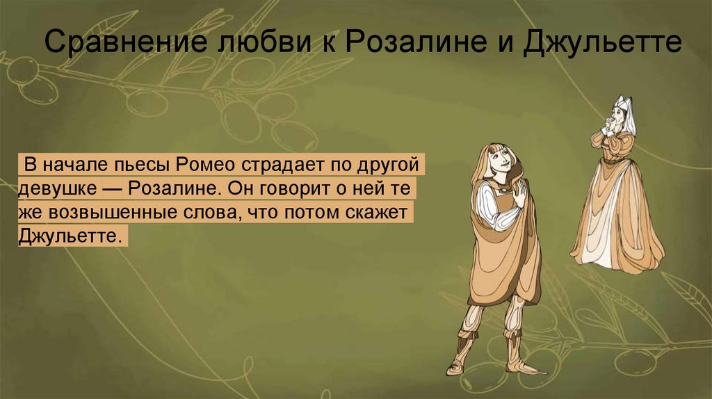 Сравнение любви к Розалине и ДжульеттеВ начале пьесы Ромео страдает по другой