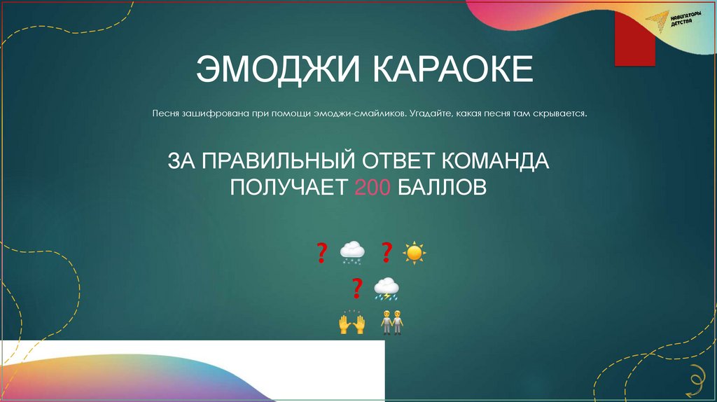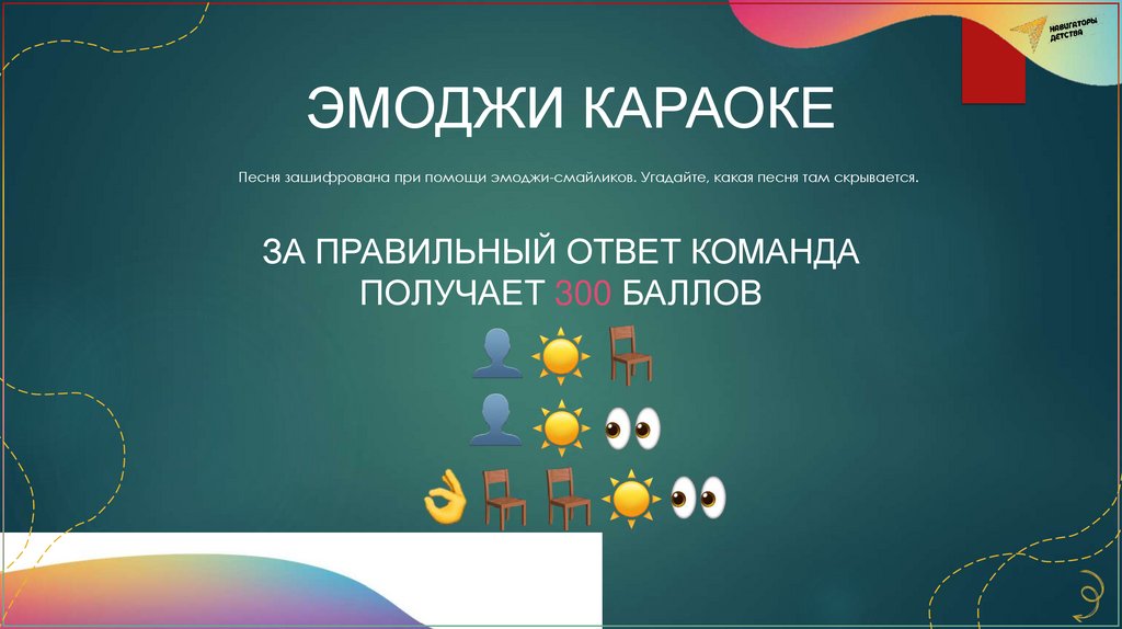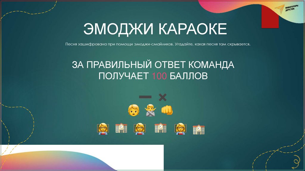 ЭМОДЖИ КАРАОКЕПесня зашифрована при помощи эмоджи-смайликов. Угадайте, какая песня там скрывается.