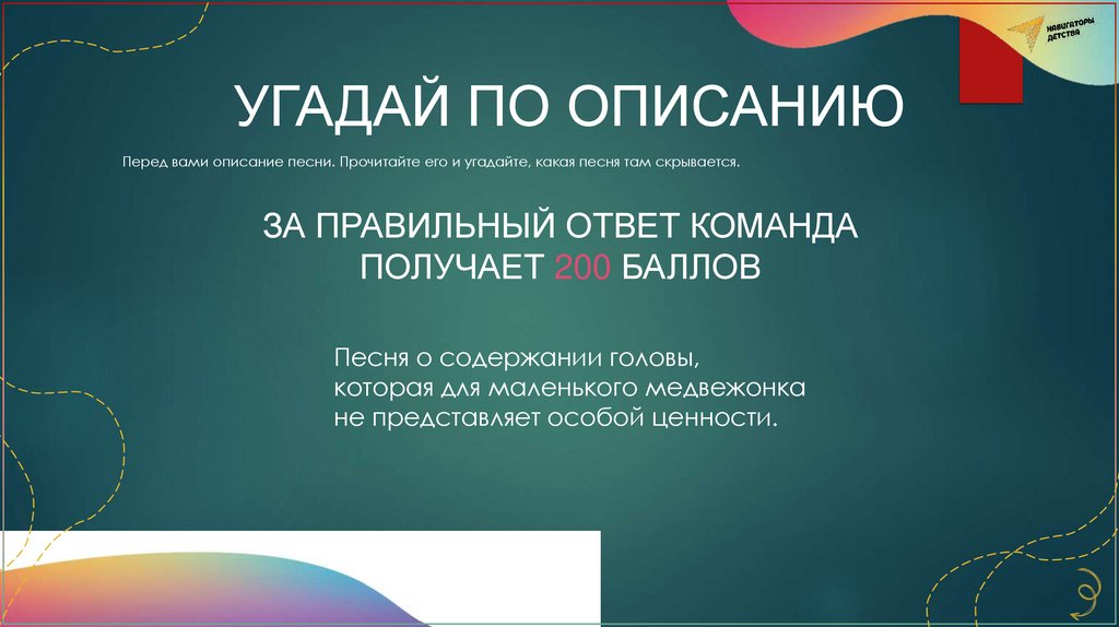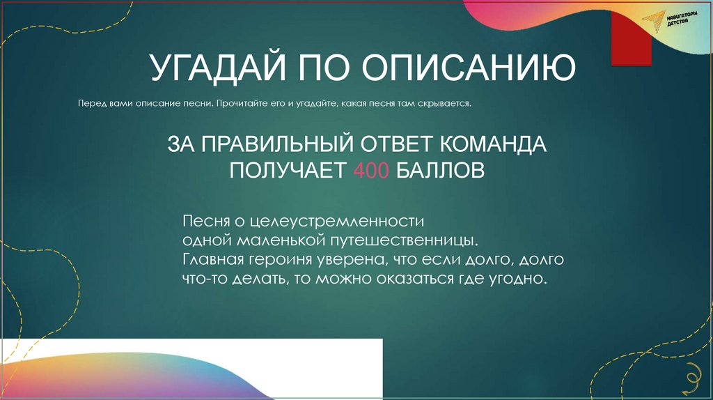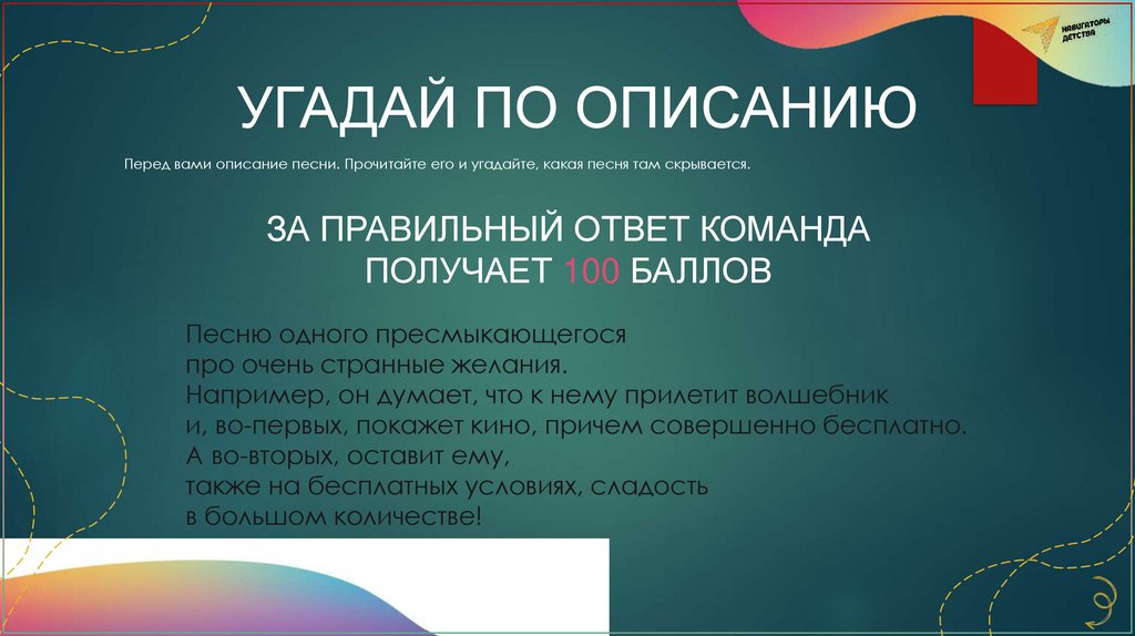 УГАДАЙ ПО ОПИСАНИЮПеред вами описание песни. Прочитайте его и угадайте, какая песня там скрывается.