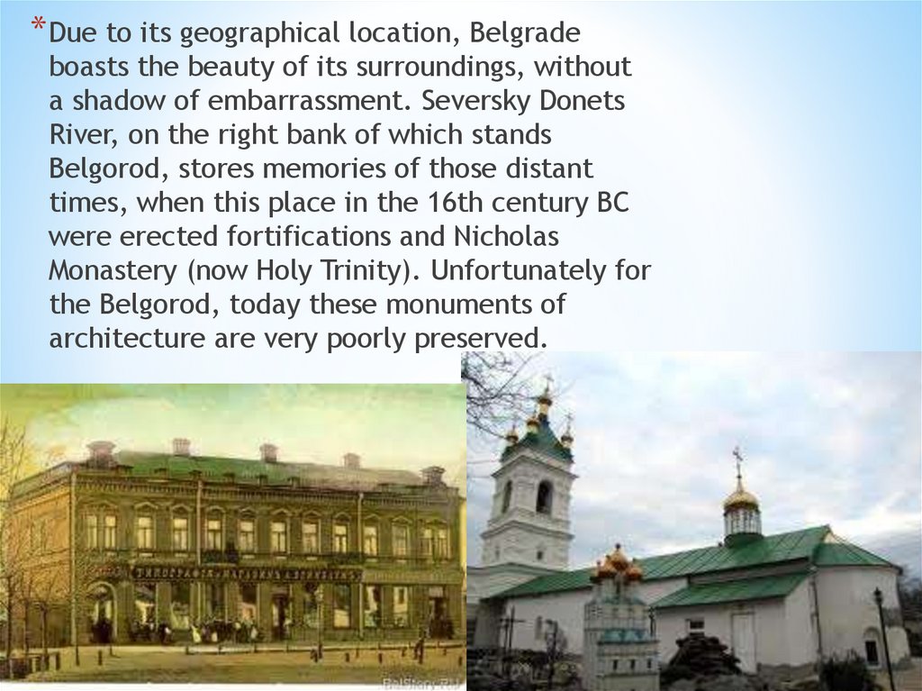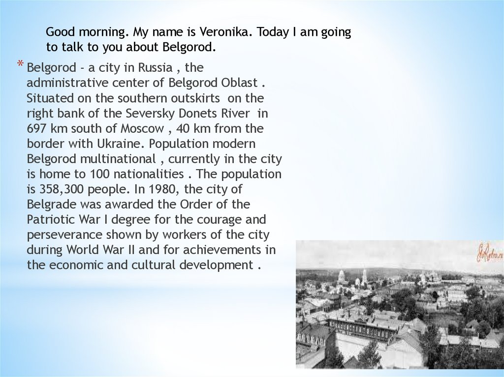 Good morning. My name is Veronika. Today I am goingto talk to you about Belgorod.