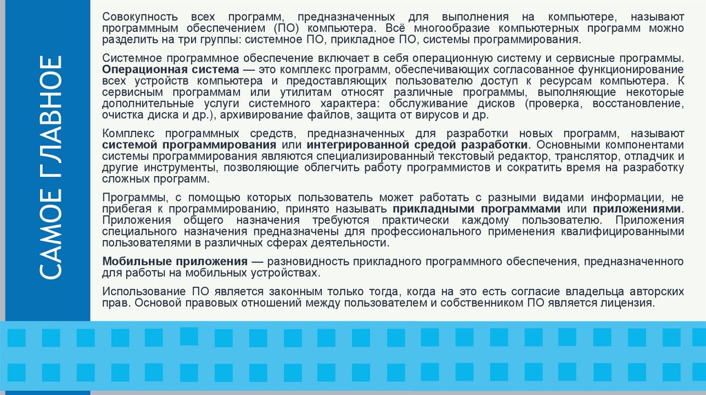 САМОЕ ГЛАВНОЕСовокупность всех программ, предназначенных для выполнения на компьютере, называют