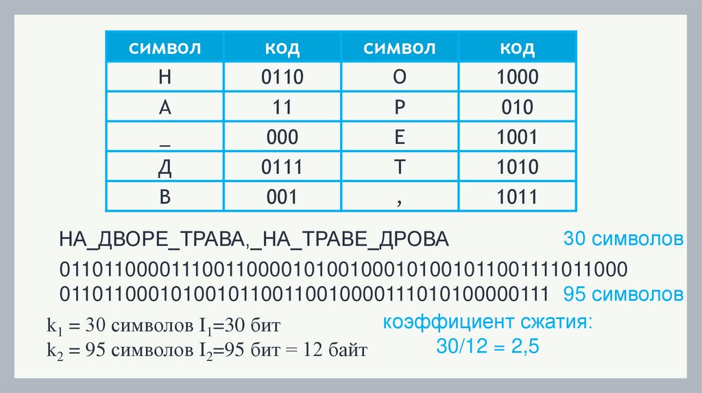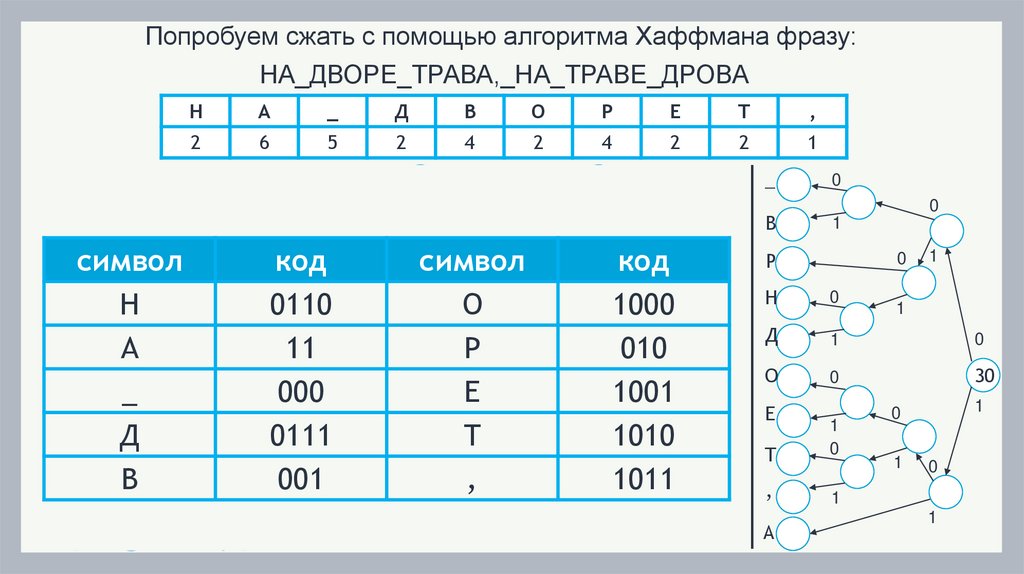 Попробуем сжать с помощью алгоритма Хаффмана фразу:НА_ДВОРЕ_ТРАВА,_НА_ТРАВЕ_ДРОВА