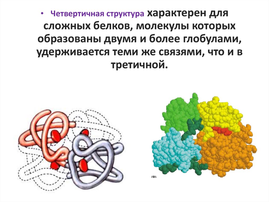 • Четвертичная структура характерен длясложных белков, молекулы которых