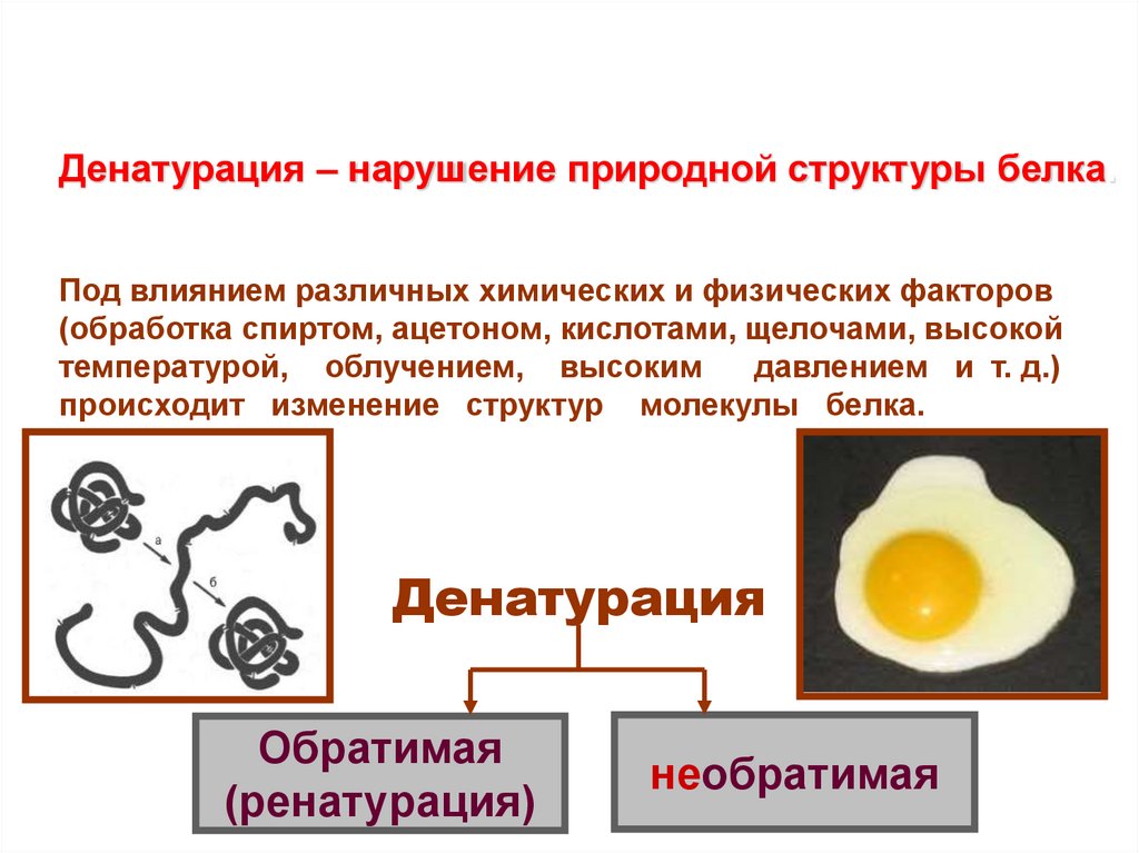 Денатурация – нарушение природной структуры белка.Под влиянием различных химических и физических факторов