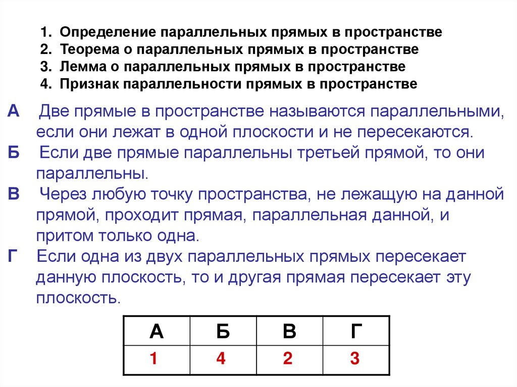 1. Определение параллельных прямых в пространстве2. Теорема о параллельных прямых в пространстве