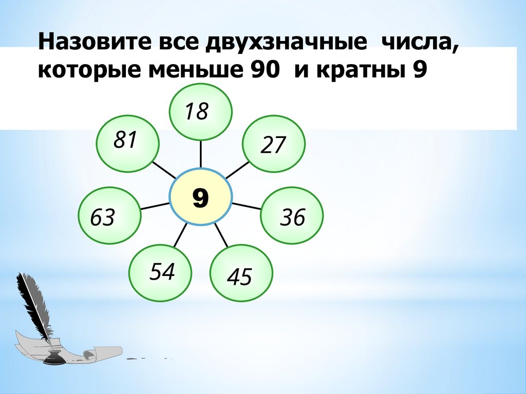Назовите все двухзначные числа,которые меньше 90 и кратны 9