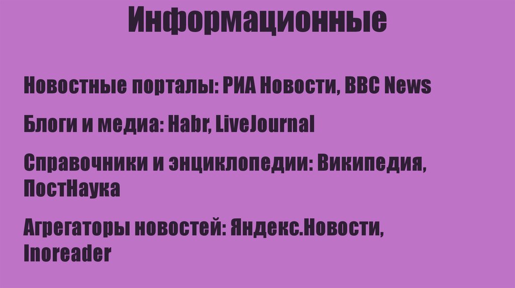 ИнформационныеНовостные порталы: РИА Новости, BBC News