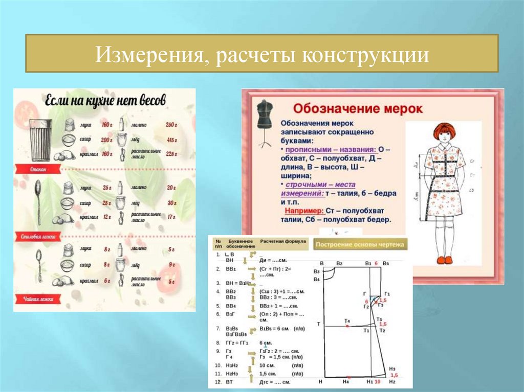 Например: снятие мерок для построения чертежа, втачивание