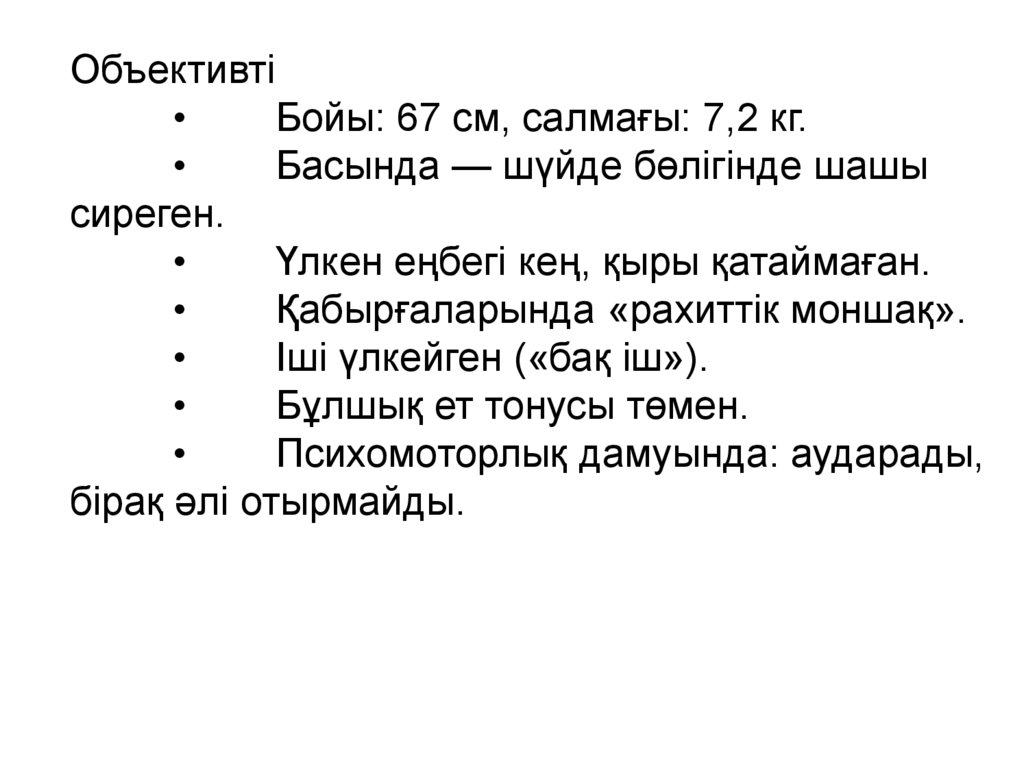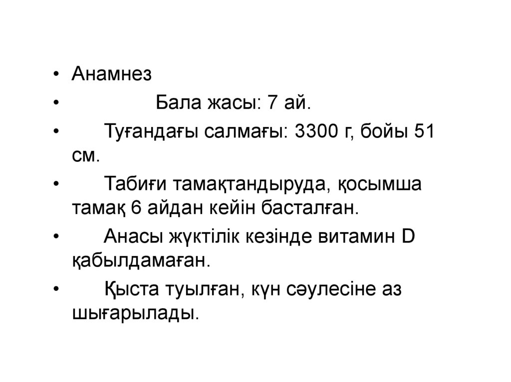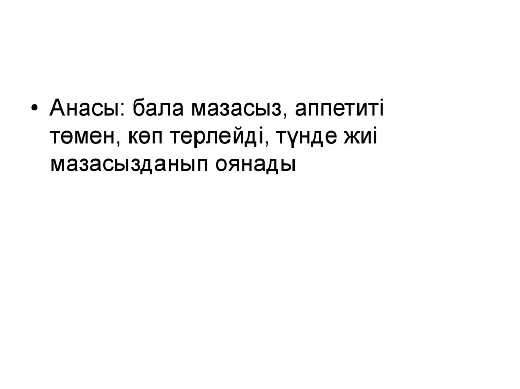 • Анасы: бала мазасыз, аппетитітөмен, көп терлейді, түнде жиі