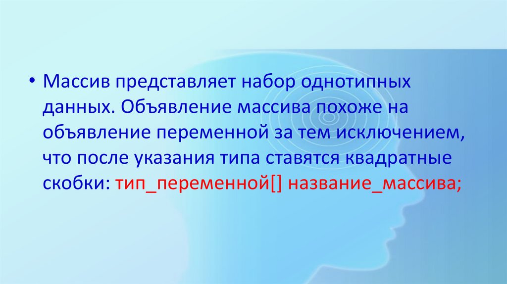 • Массив представляет набор однотипныхданных. Объявление массива похоже на