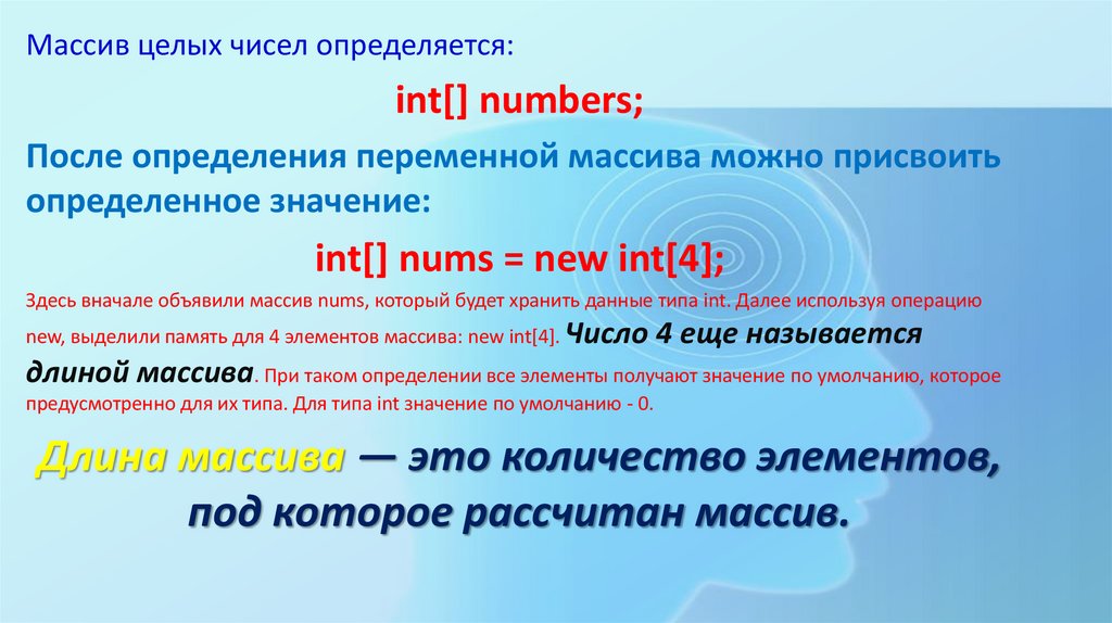 длиной массива. При таком определении все элементы получают значение по умолчанию, которое