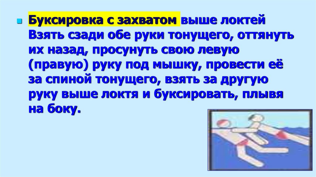 Буксировка с захватом выше локтейВзять сзади обе руки тонущего, оттянуть