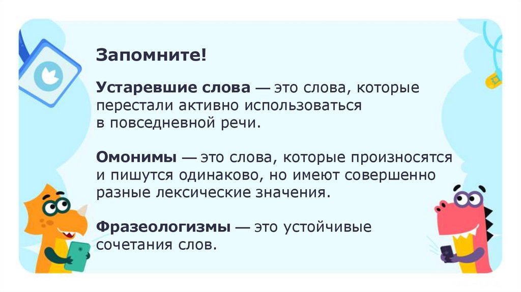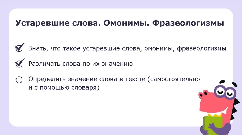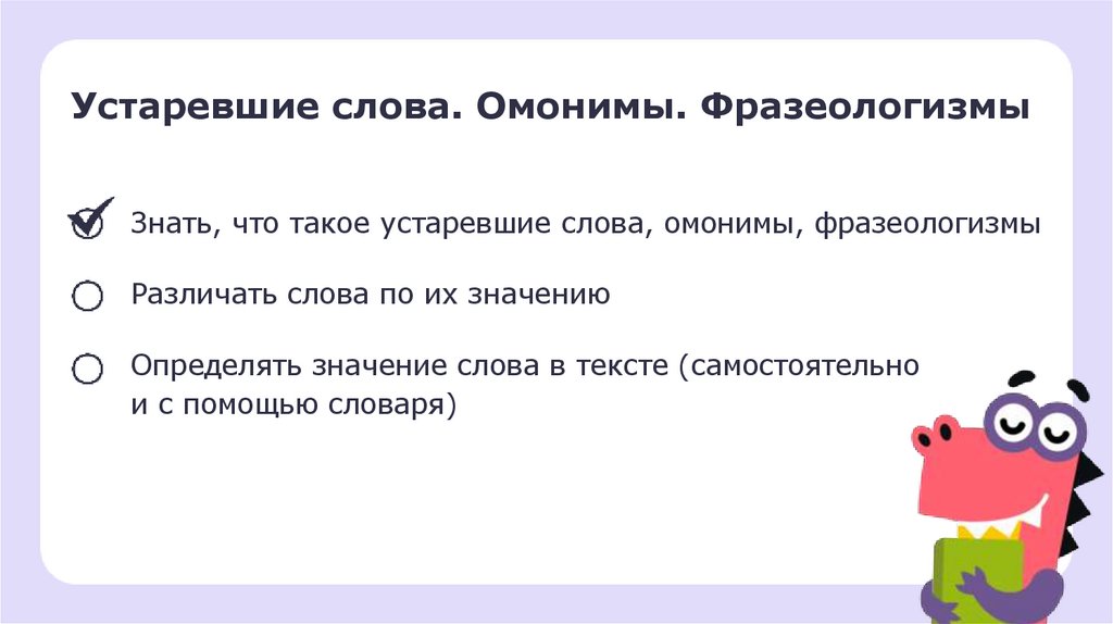 Устаревшие слова. Омонимы. ФразеологизмыЗнать, что такое устаревшие слова, омонимы, фразеологизмы