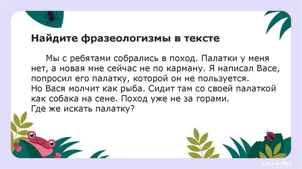 Найдите фразеологизмы в текстеМы с ребятами собрались в поход. Палатки у меня