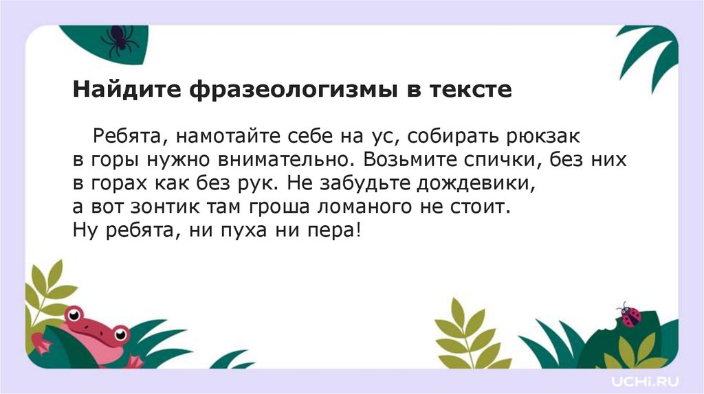 Найдите фразеологизмы в текстеРебята, намотайте себе на ус, собирать рюкзак