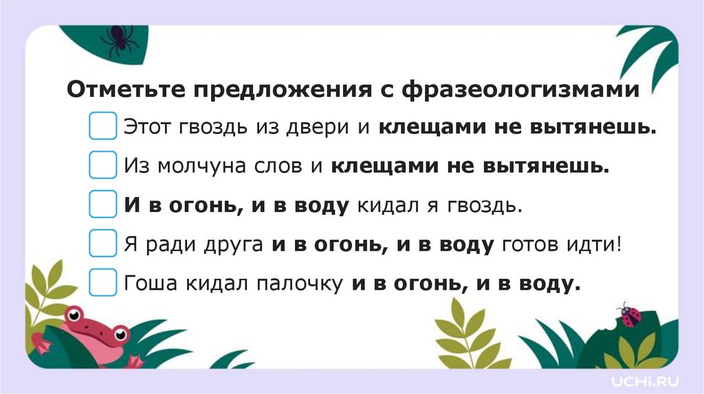 Отметьте предложения с фразеологизмамиЭтот гвоздь из двери и клещами не вытянешь.