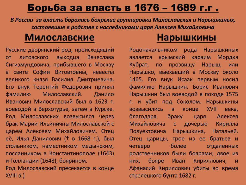 Борьба за власть в 1676 – 1689 г.г .В России за власть боролись боярские группировки Милославских и Нарышкиных,
