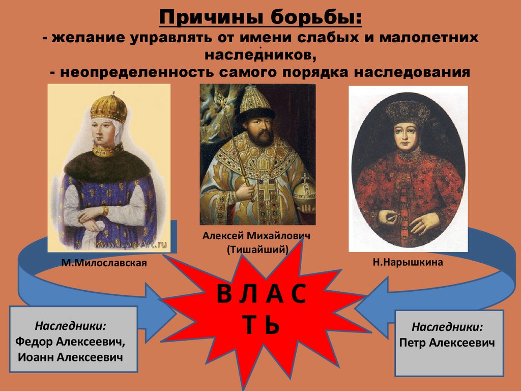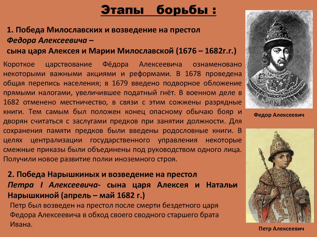 Этапы борьбы :1. Победа Милославских и возведение на престол