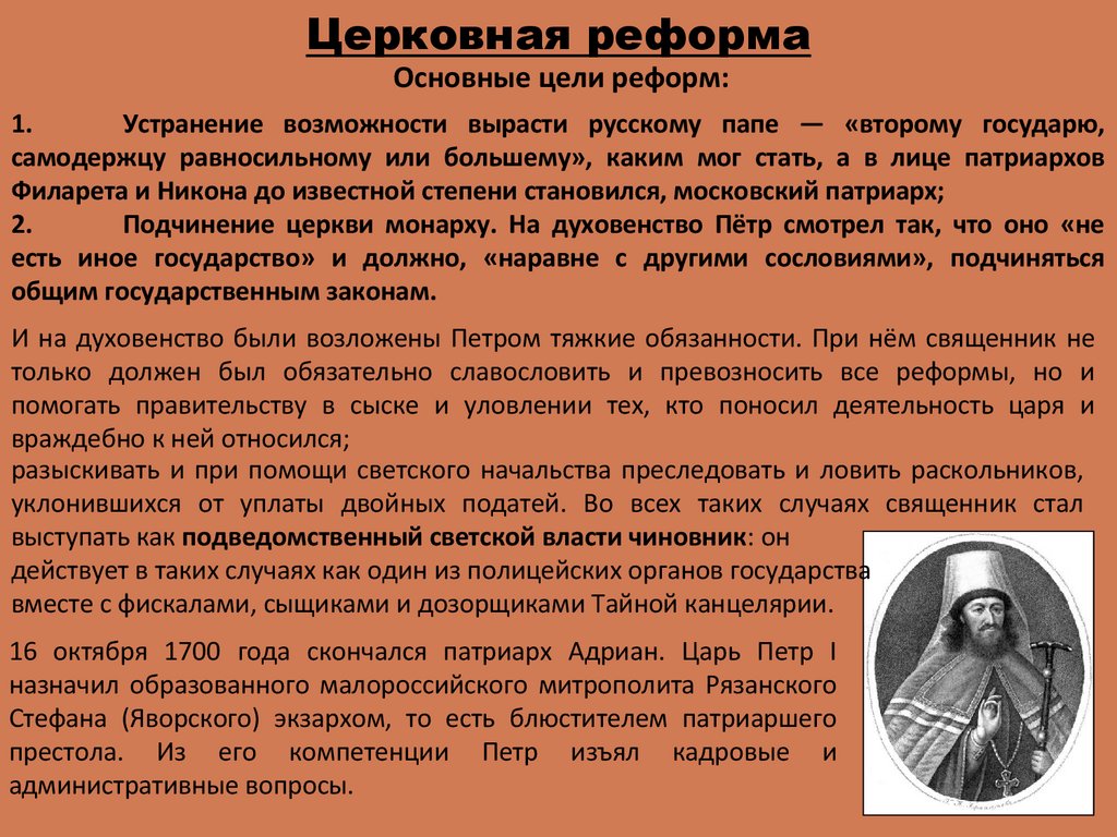 Подчинение церкви монарху. На духовенство Пётр смотрел так, что оно «не