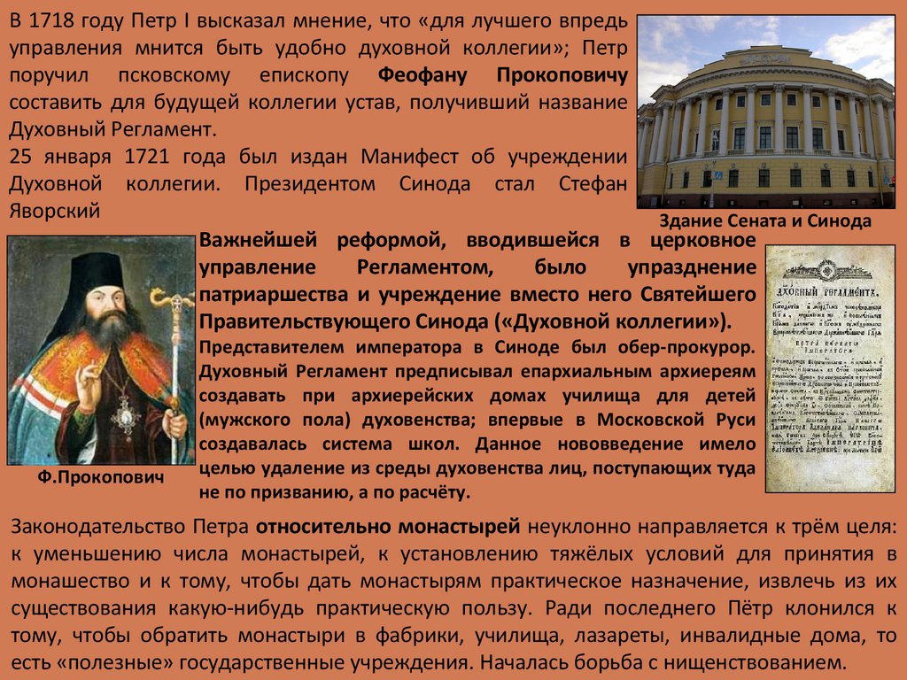 В 1718 году Петр I высказал мнение, что «для лучшего впредьуправления мнится быть удобно духовной коллегии»; Петр