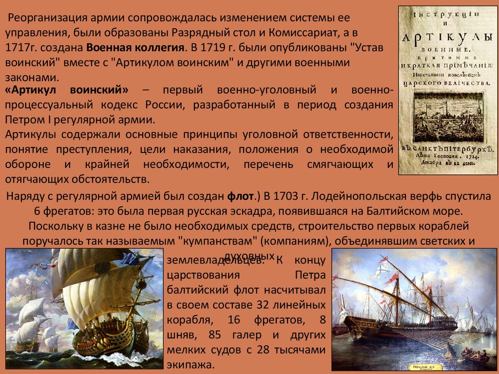 1717г. создана Военная коллегия. В 1719 г. были опубликованы "Устав