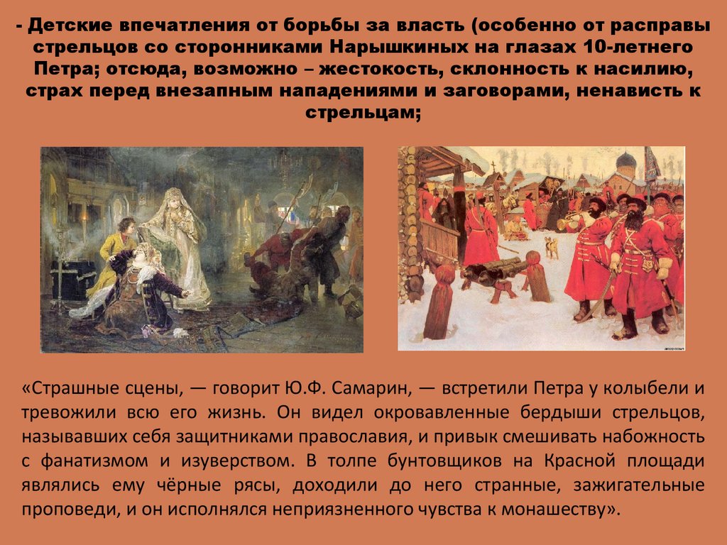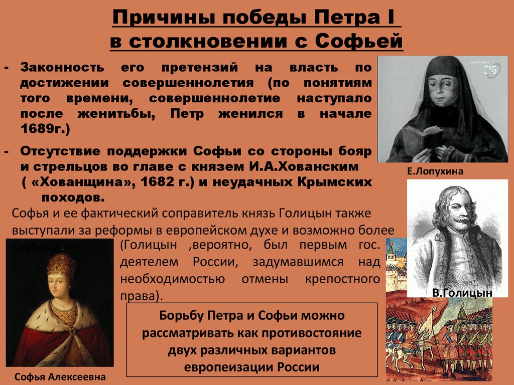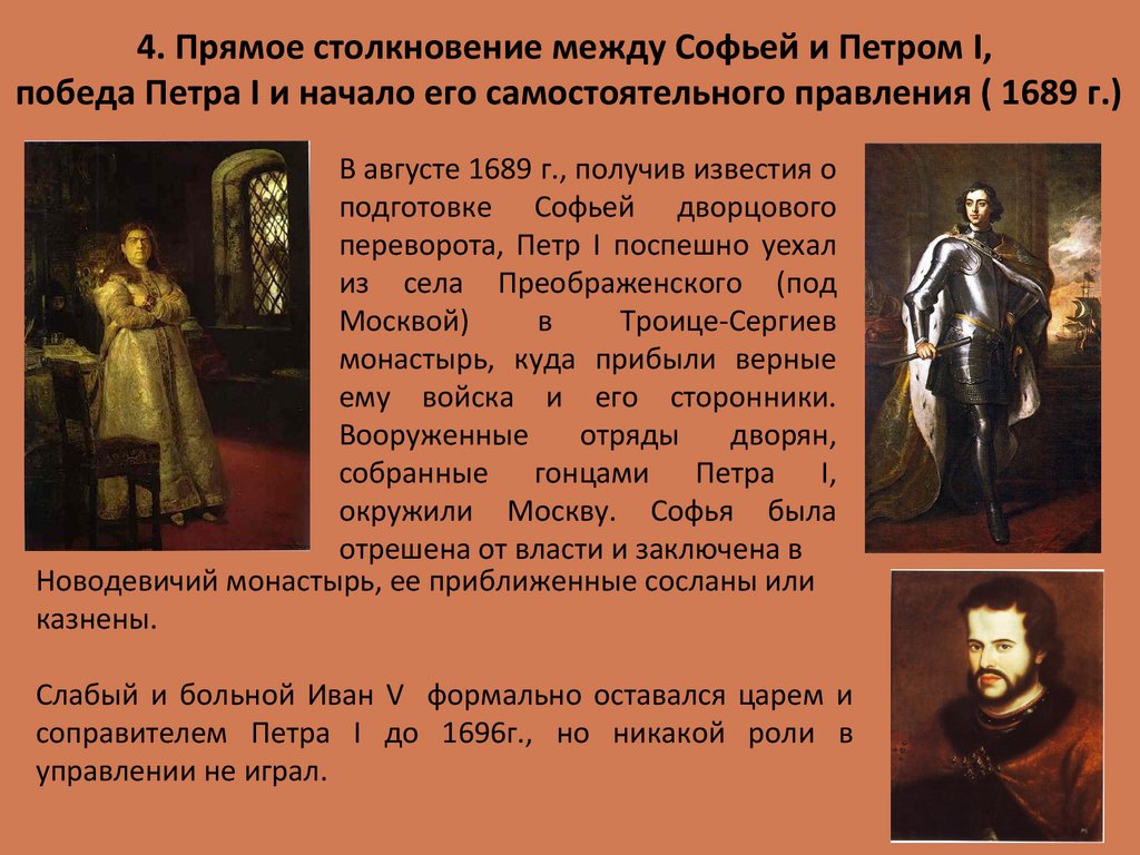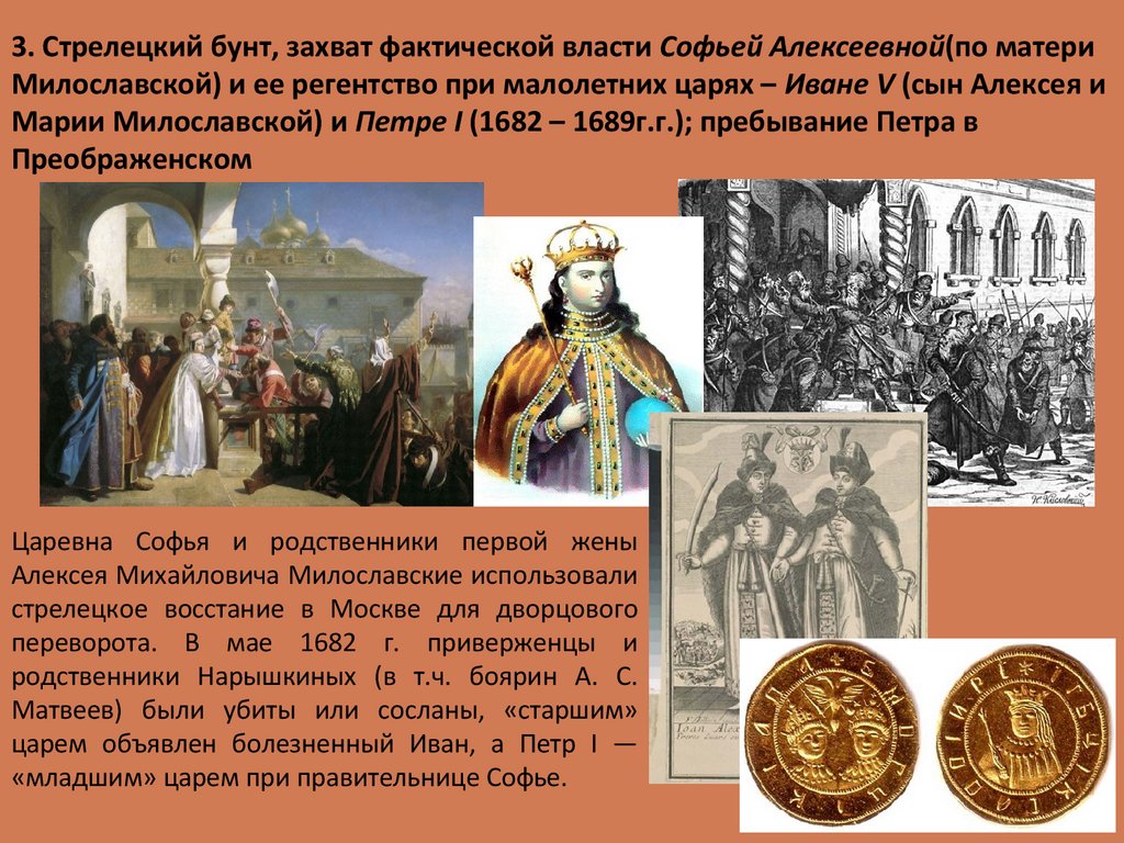 3. Стрелецкий бунт, захват фактической власти Софьей Алексеевной(по материМилославской) и ее регентство при малолетних царях – Иване V (сын Алексея и
