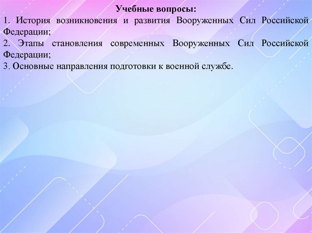 Учебные вопросы:1. История возникновения и развития Вооруженных Сил Российской