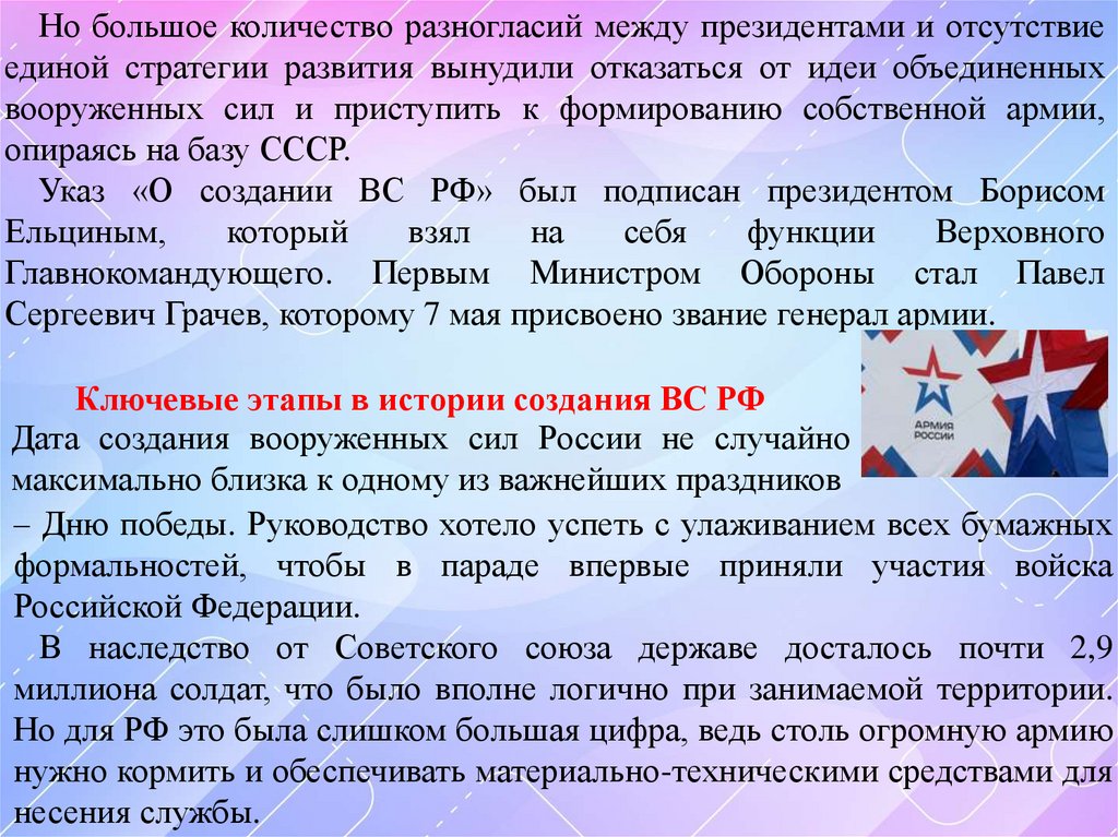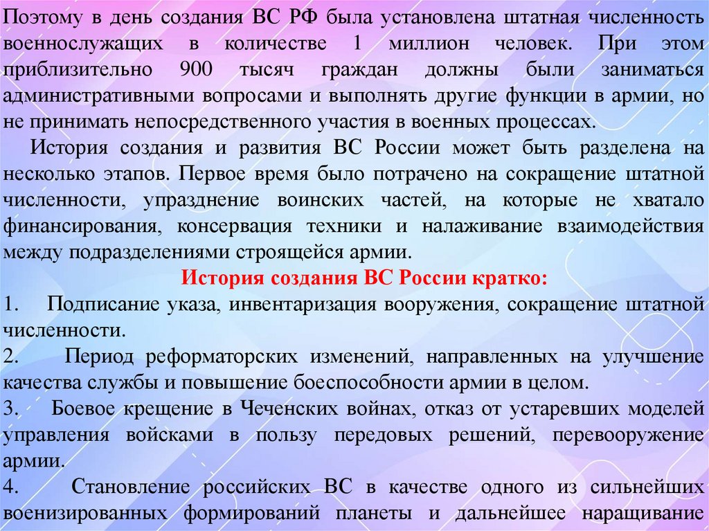 Поэтому в день создания ВС РФ была установлена штатная численностьвоеннослужащих в количестве 1 миллион человек. При этом