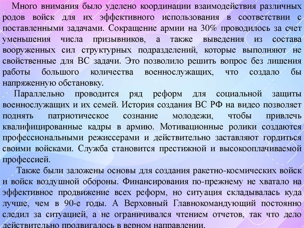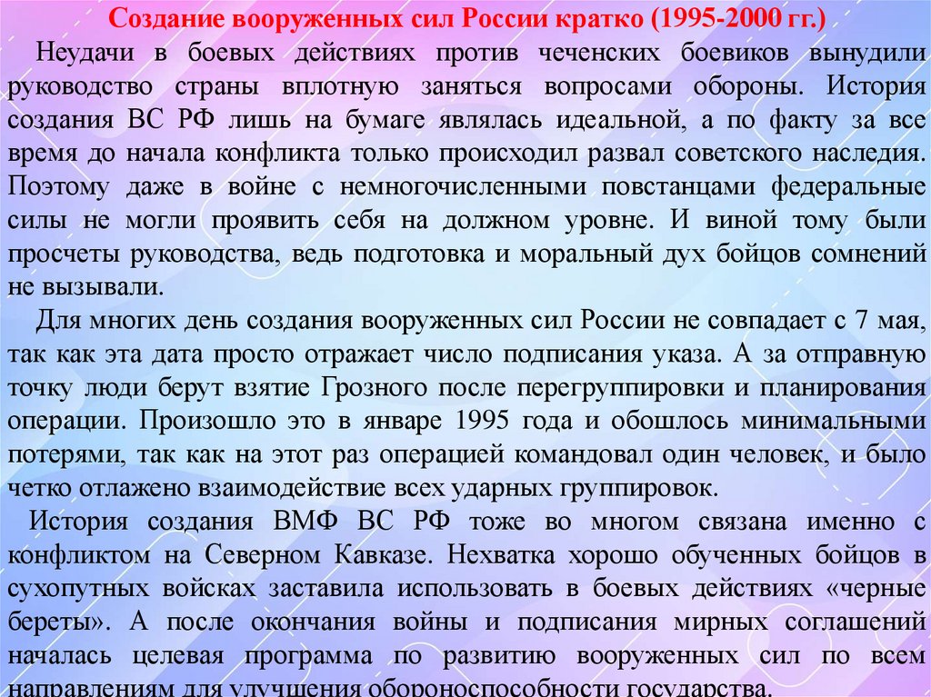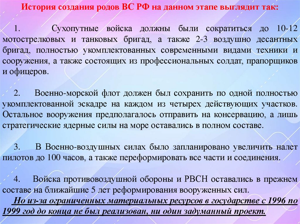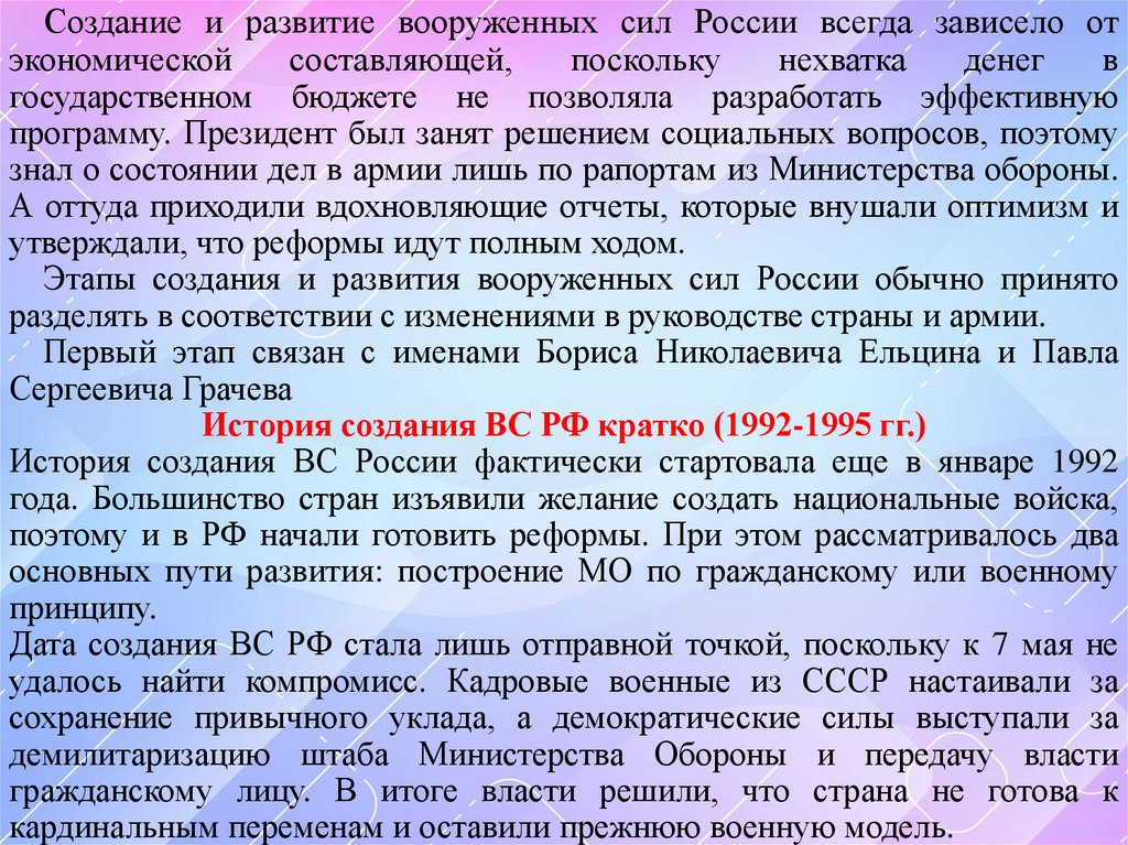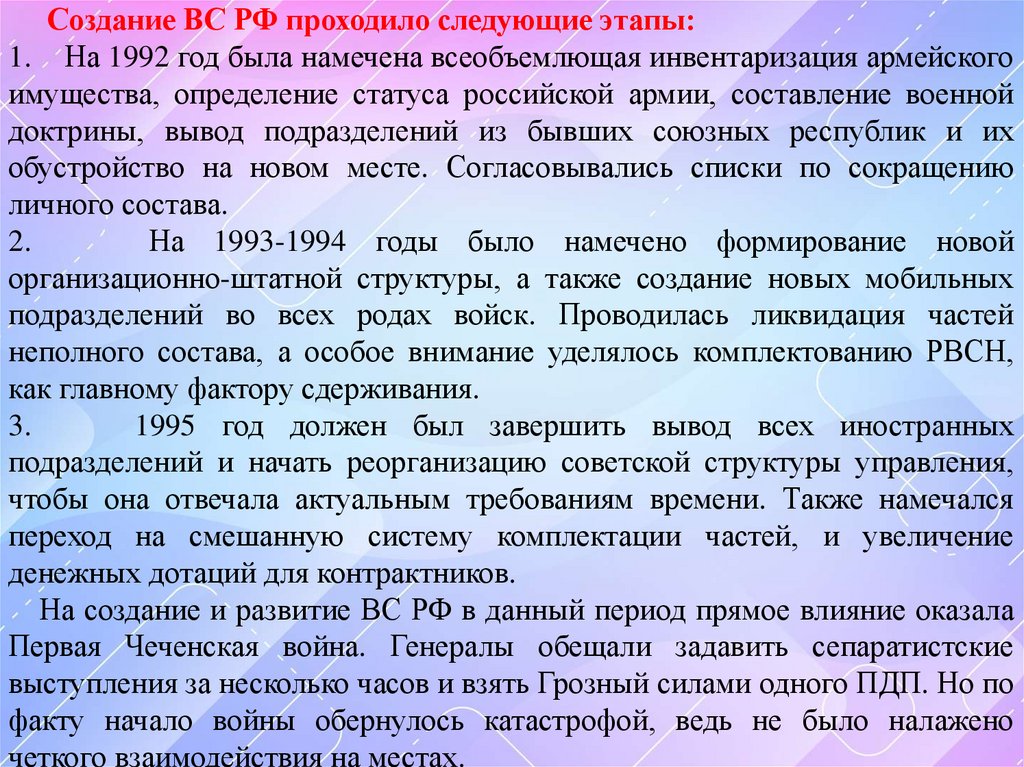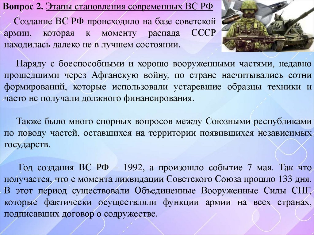 Вопрос 2. Этапы становления современных ВС РФСоздание ВС РФ происходило на базе советской
