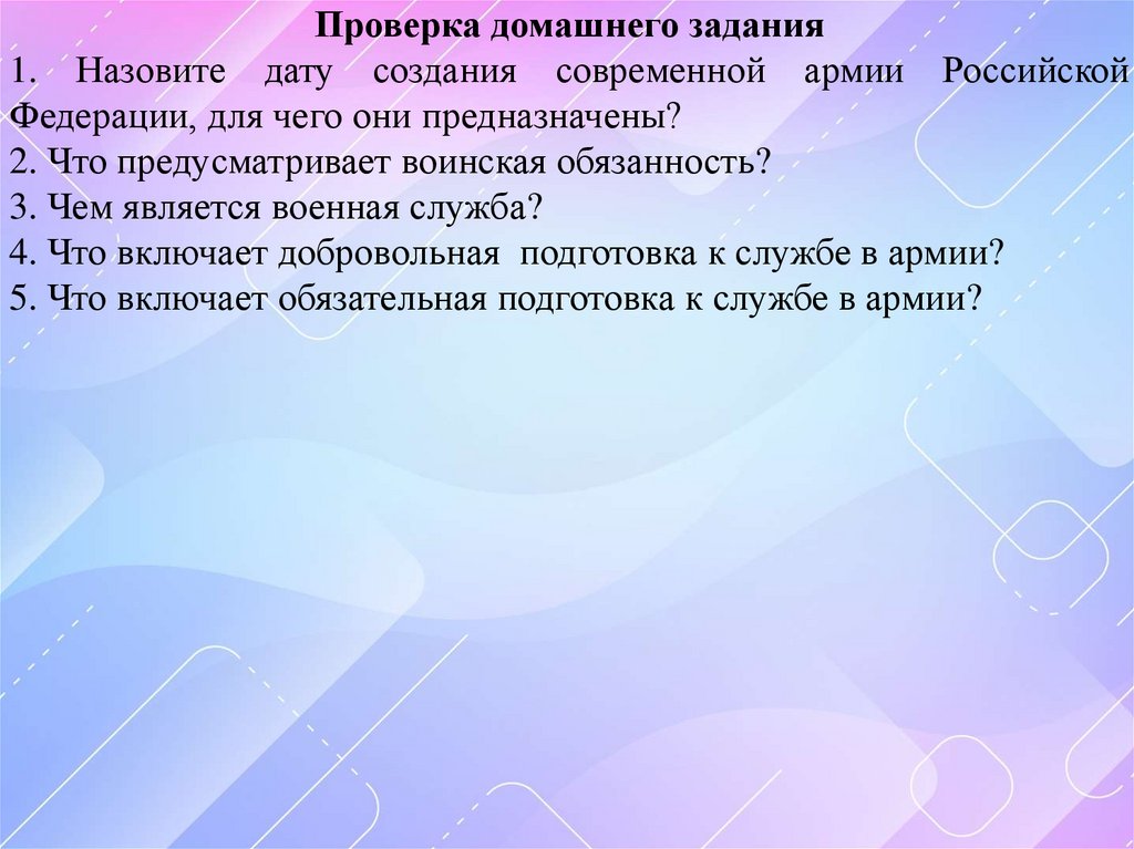 Проверка домашнего задания1. Назовите дату создания современной армии Российской