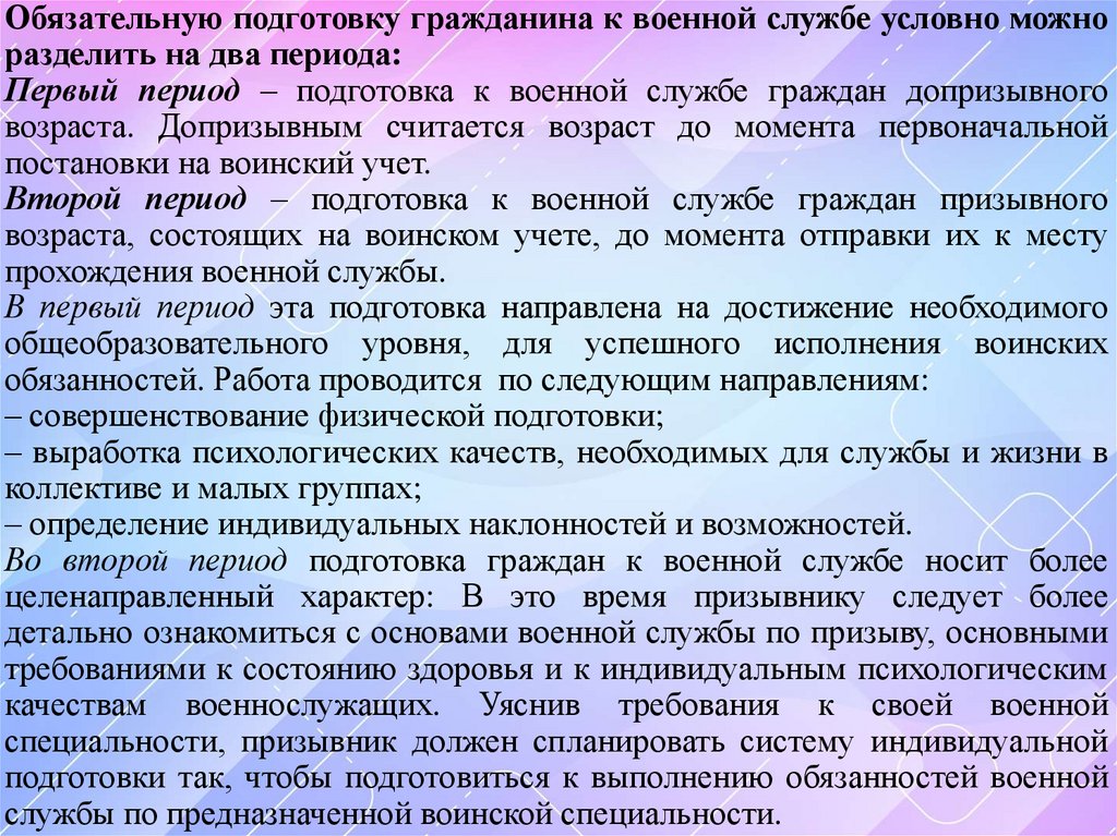 Обязательную подготовку гражданина к военной службе условно можноразделить на два периода: