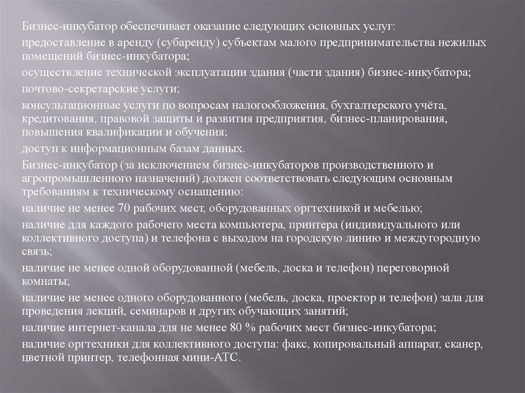 юридических услуг. Общая площадь нежилых помещений бизнесинкубатора должна быть не менее 900 кв.м, при этом площадь,