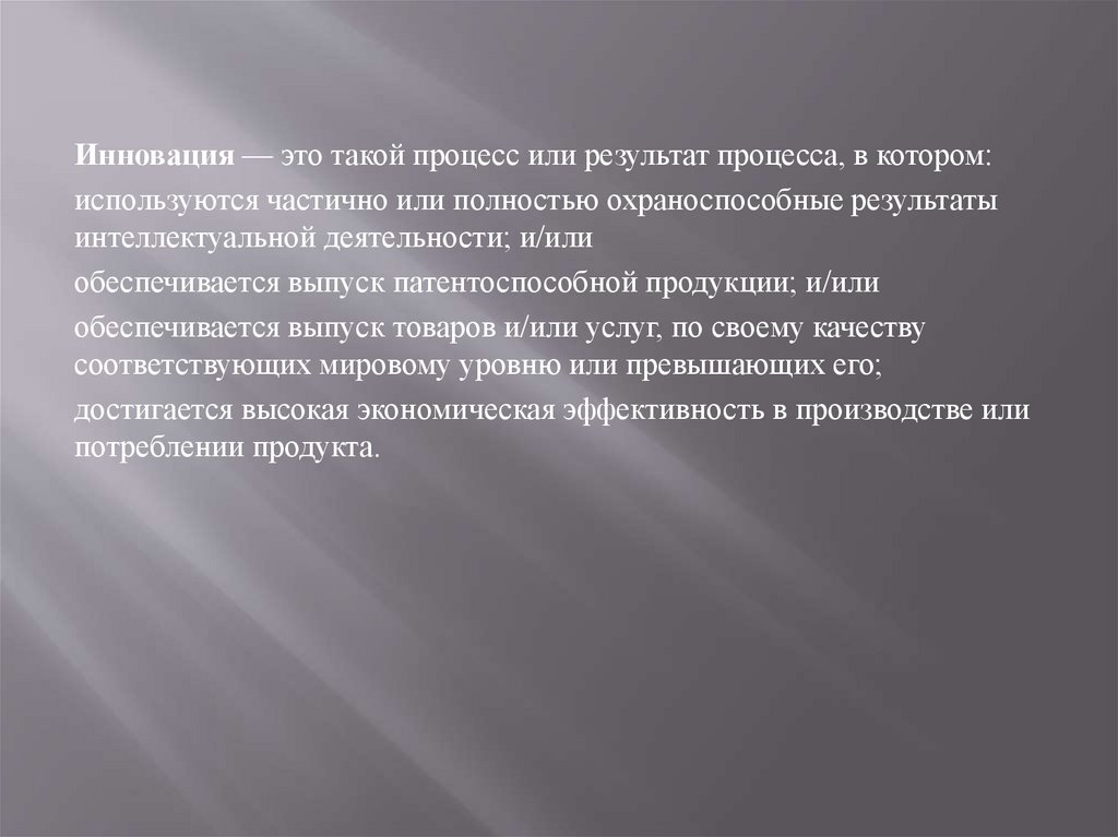 Инновация — это такой процесс или результат процесса, в котором:используются частично или полностью охраноспособные результаты