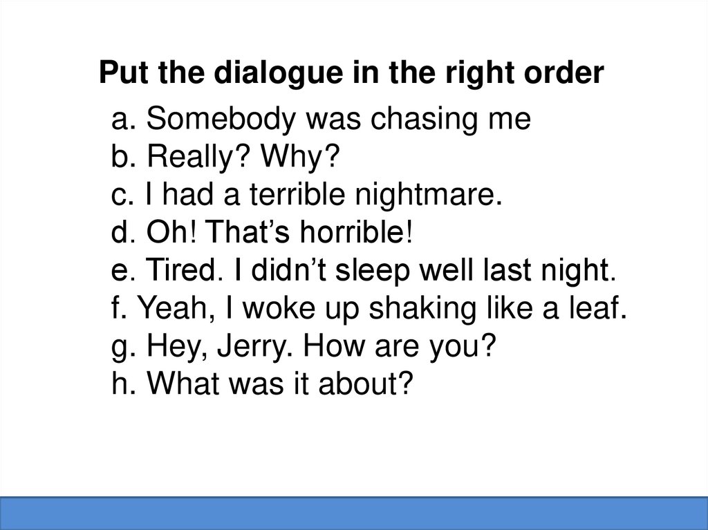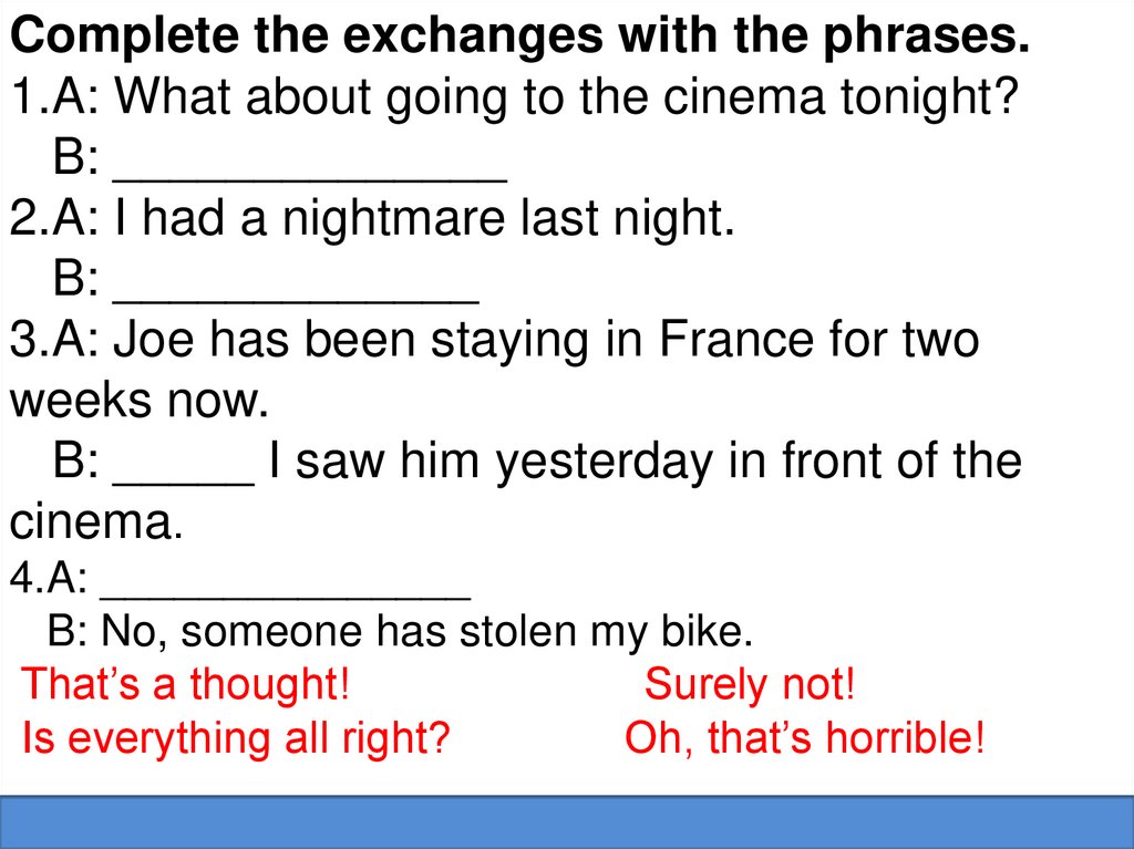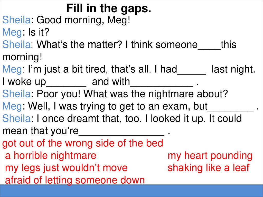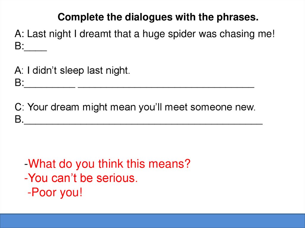 Complete the dialogues with the phrases.A: Last night I dreamt that a huge spider was chasing me!
