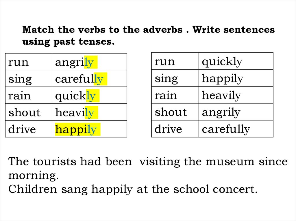Match the verbs to the adverbs . Write sentencesusing past tenses.