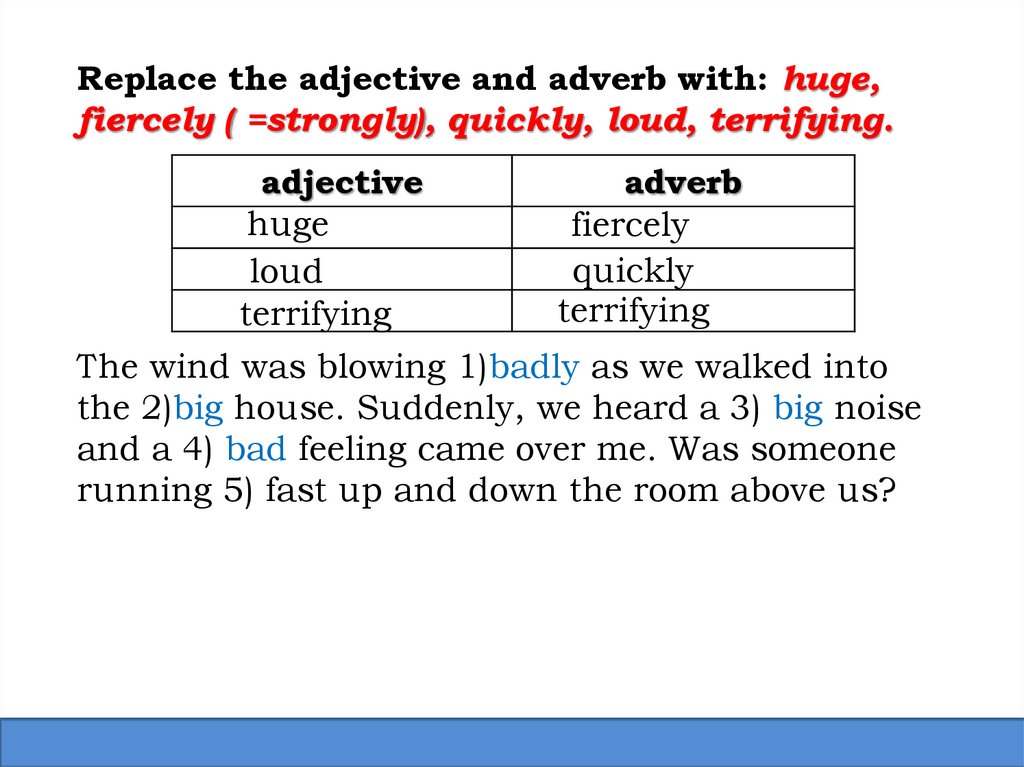 Replace the adjective and adverb with: huge,fiercely ( =strongly), quickly, loud, terrifying.
