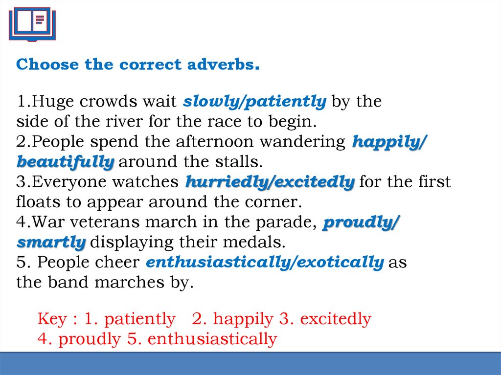 Choose the correct adverbs.1.Huge crowds wait slowly/patiently by the
