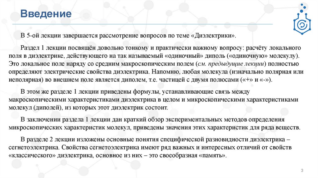 ВведениеВ 5-ой лекции завершается рассмотрение вопросов по теме «Диэлектрики».
