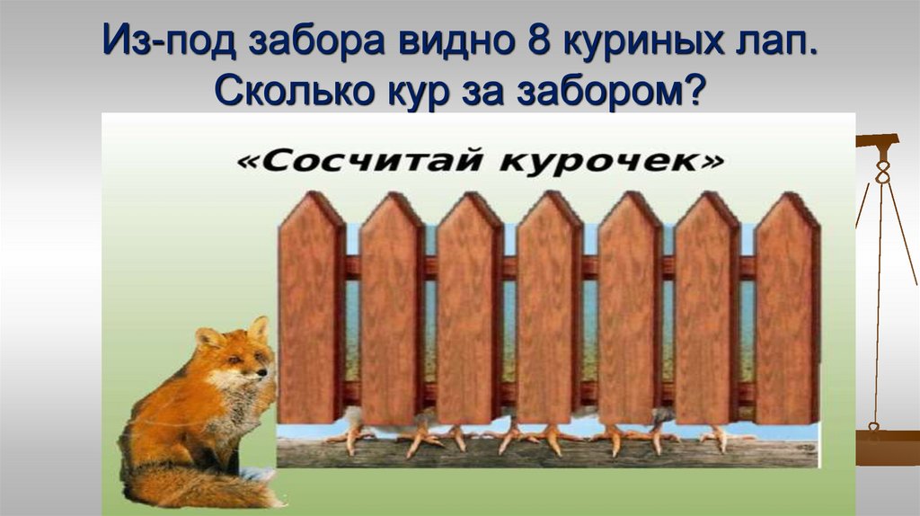 Из-под забора видно 8 куриных лап.Сколько кур за забором?