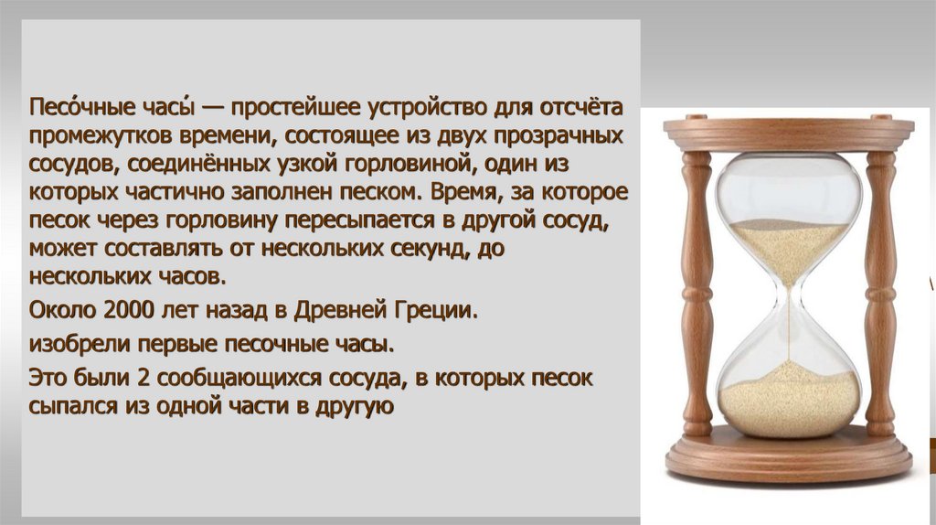 Песо́ чные часы́ — простейшее устройство для отсчётапромежутков времени, состоящее из двух прозрачных