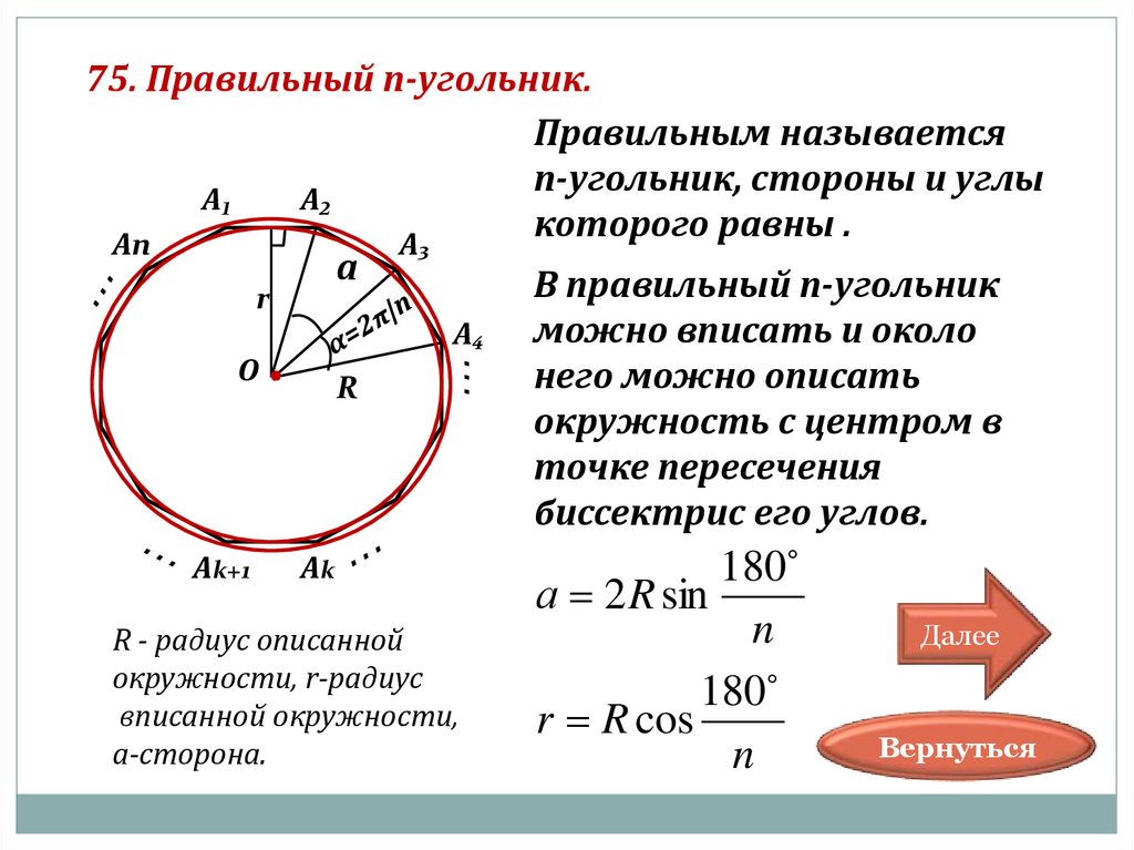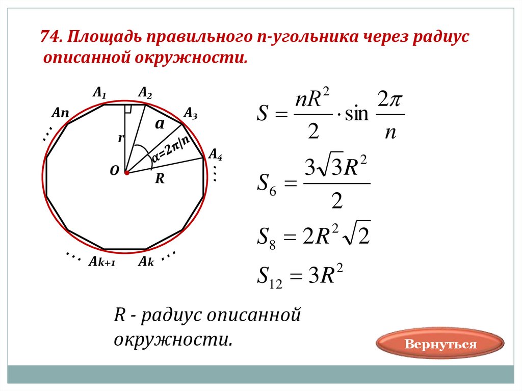 74. Площадь правильного п-угольника через радиусoписанной окружности.