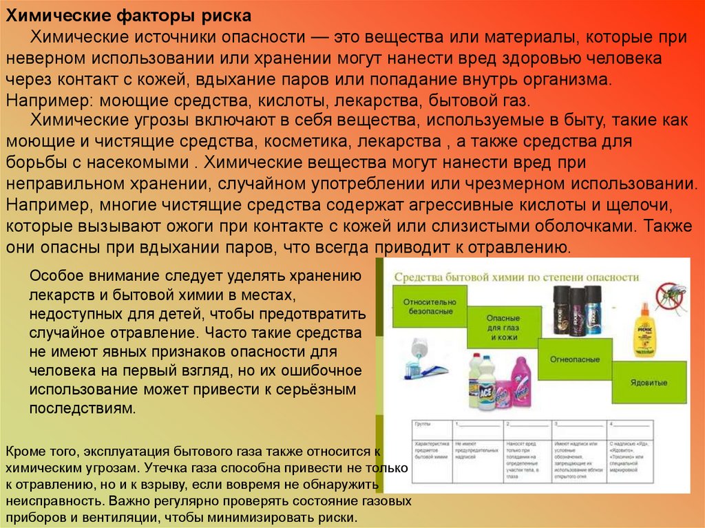 Например: моющие средства, кислоты, лекарства, бытовой газ.