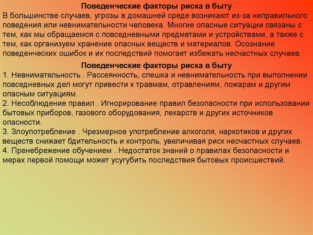 Поведенческие факторы риска в бытуВ большинстве случаев, угрозы в домашней среде возникают из-за неправильного