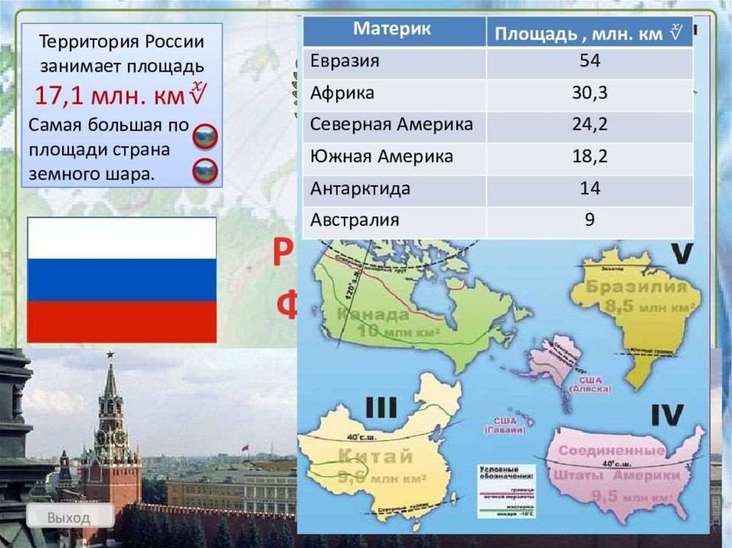 • Россия, имея многовековую историю, достигала наибольшей площади в24,5 млн км² в середине XIX в., будучи Российской Империей.
