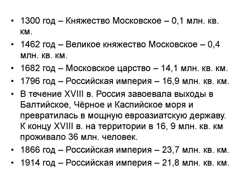 • 1300 год – Княжество Московское – 0,1 млн. кв.км.