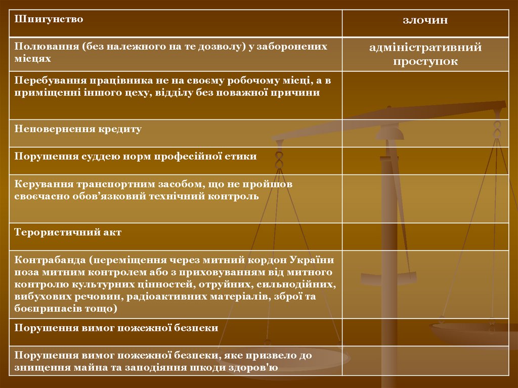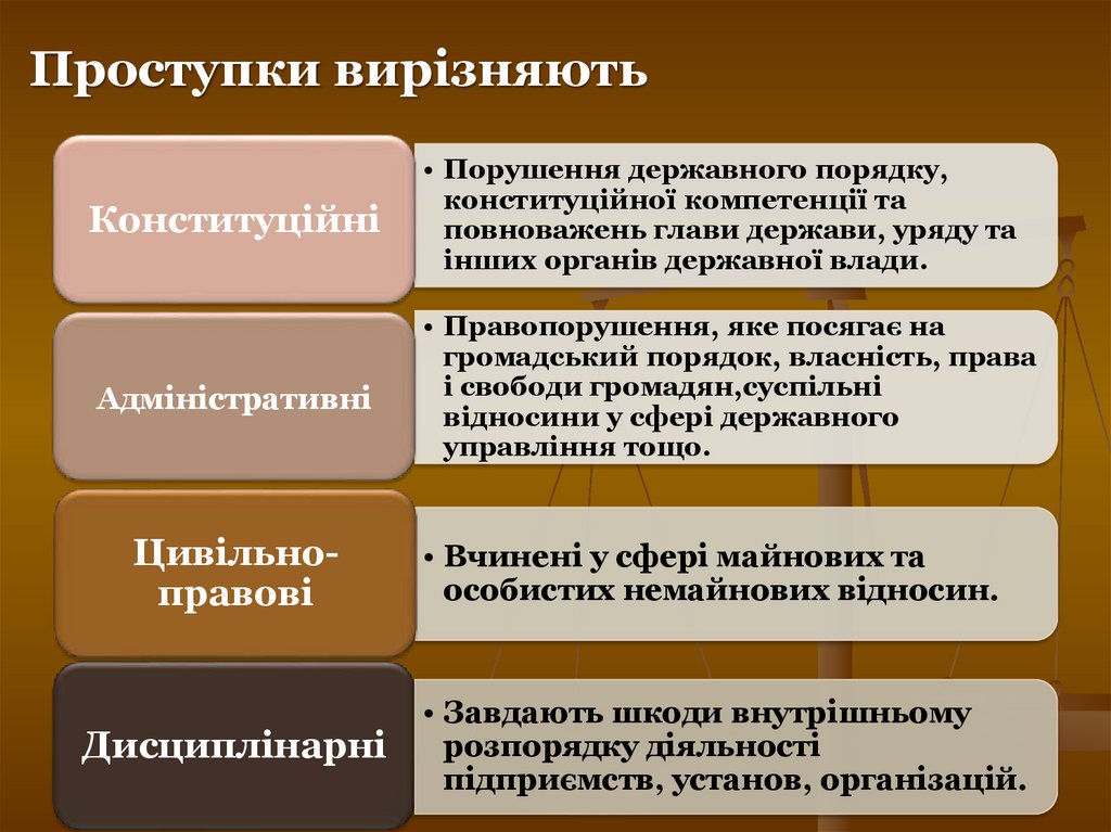 Кримінальне: вбивство, насильство, крадіжкаАдміністративне: порушення правил пожежної безпеки,